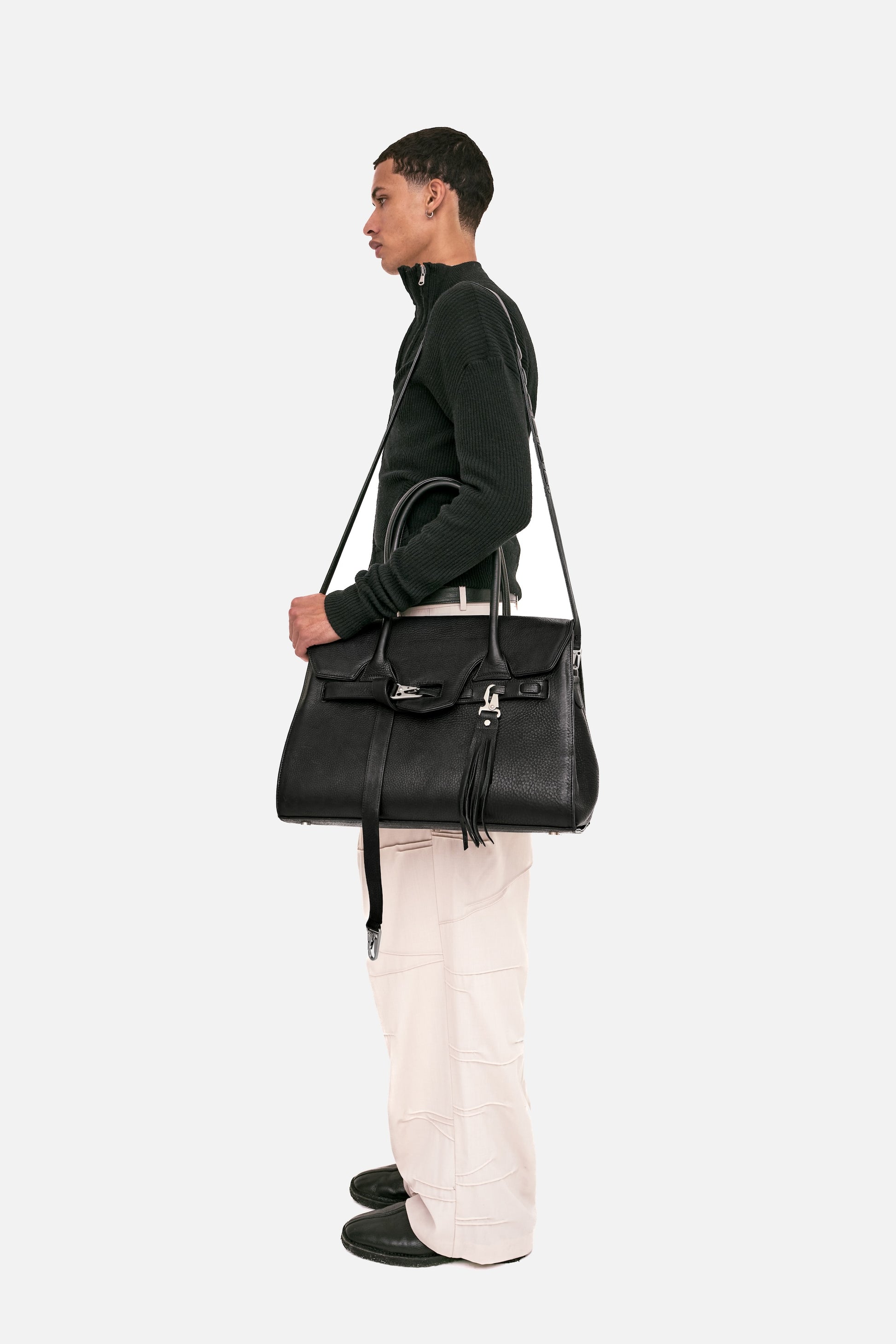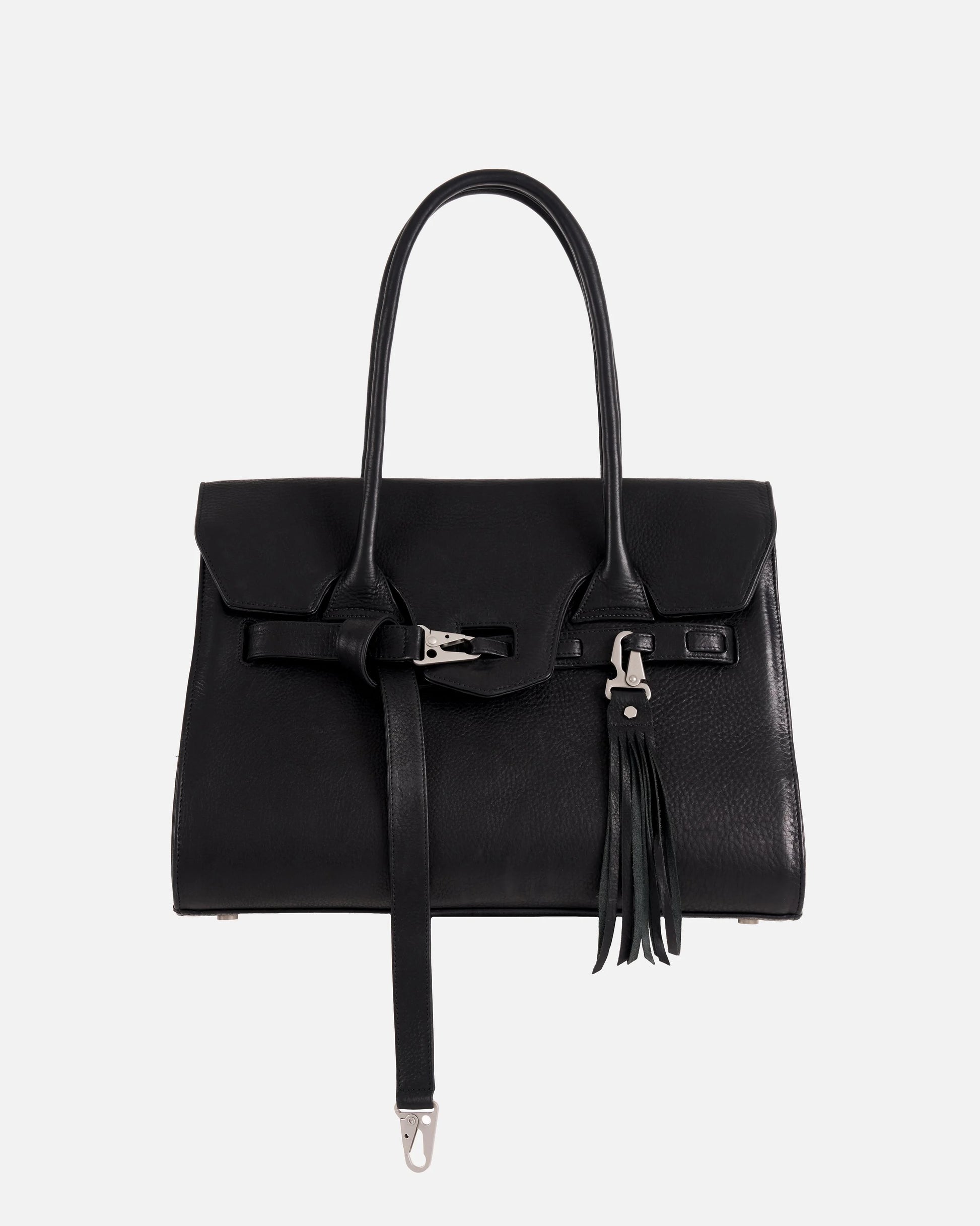 The ‘Belay’ Micro Leather Belt serves as the shoulder strap for this bag. It is optional and can be added to your order separately. Two matte silver D-rings are located on either side of the bag for this shoulder strap to be attached to.